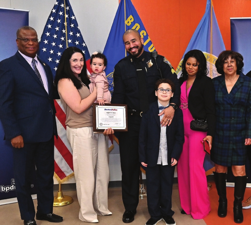 Boston Police Commissioner Michael Cox joins Sgt. Clifford Davis in a promotional ceremony for 16 BPD officers.