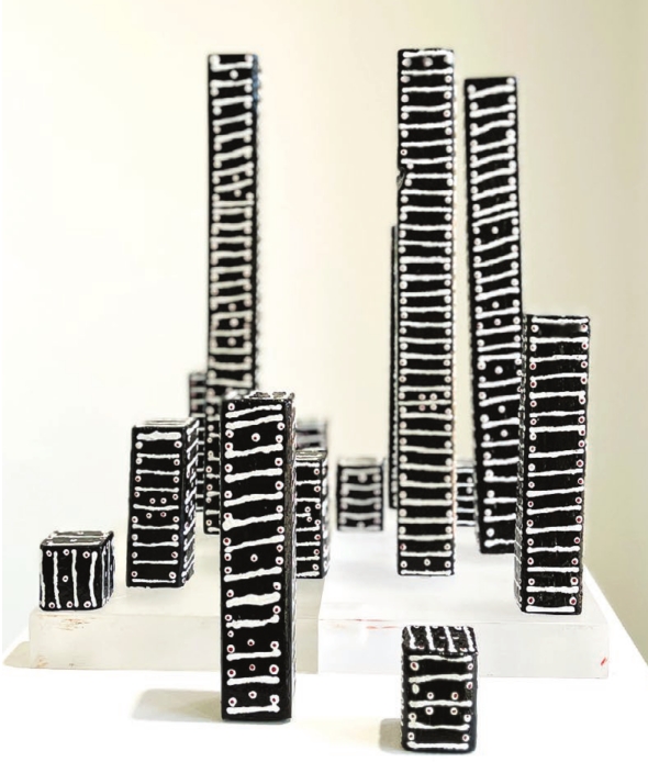 Harper’s sculptures are intimate universes. They are so layered with painted symbols, attached objects and other materials, that viewers see something new in them at every glance. The works require you to get close and personal with them, to stare, to ponder, to come back again for another look.