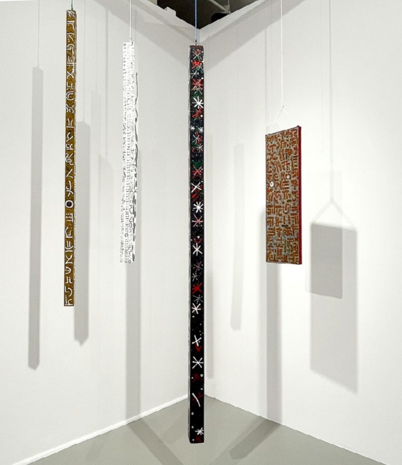 Harper draws on his experience as a Black gay man to ruminate on love, loss, style, queerness and perseverance in this exhibit of sculptural works. Each of his pieces is covered in symbols, dots, lines, curves and staccato flicks of the brush. These symbols invoke language, they look ancient and powerful, but they don’t correlate to a known script we can read.