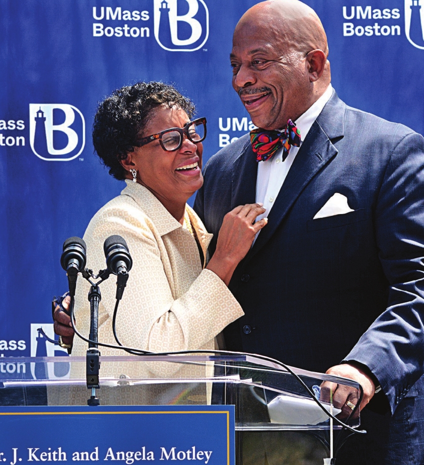 UMass Boston Chancellor Emeritus Dr. J. Keith Motley and former first lady Angela Motley at the dedication of their new residence hall. Hundreds gathered to celebrate their commitment to providing on campus student housing.