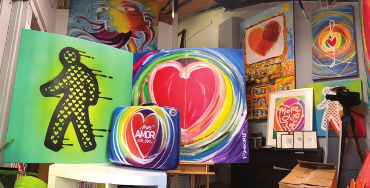 Artist Franklin Marval, also working at Humphreys Street Studios, joined the organizational team to bring back Dorchester Open Studios after the pandemic shutdowns. Marval is known for his paintings of hearts, which he began in the wake of the Boston Marathon bombing as a way of spreading love during a difficult time. He will have variations on this theme on display in his studio.