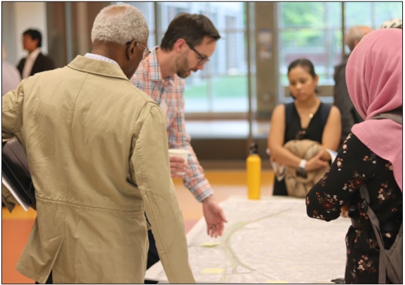 Above: Phillip Cutter points to map with David Lee and Mela Bush Miles looking on. Left: David Lee and a Longwood Collective representative study plans.