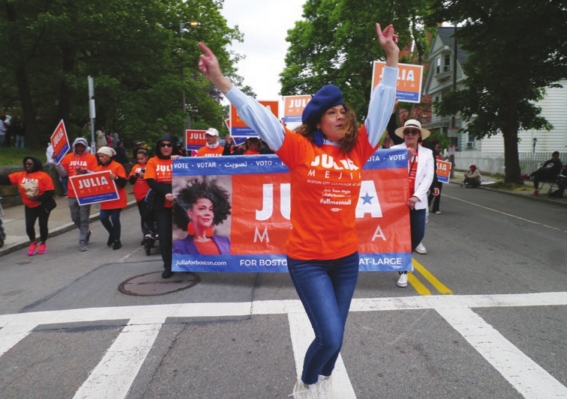 In the at-large Council race, incumbents Julia Mejia, Ruthzee Louijeune and Erin Murphy made appearances, marching with large contingents.