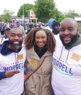 City Councilor Brian Worrell and state Reps. Brandy Fluker Oakley and Chris Worrell (right) prepare to march in Lower Mills.