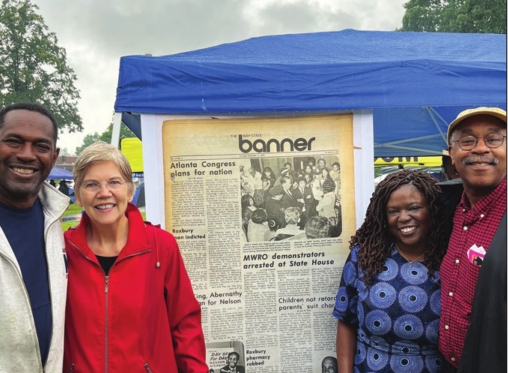 Bay State Banner Publisher/Editor Ron Miller (l) and Associate Publisher Andre Stark (r) share a moment with Sen. Elizabeth Warren and Boston City Councilor Ruthzee Louijeune at the Banner booth.