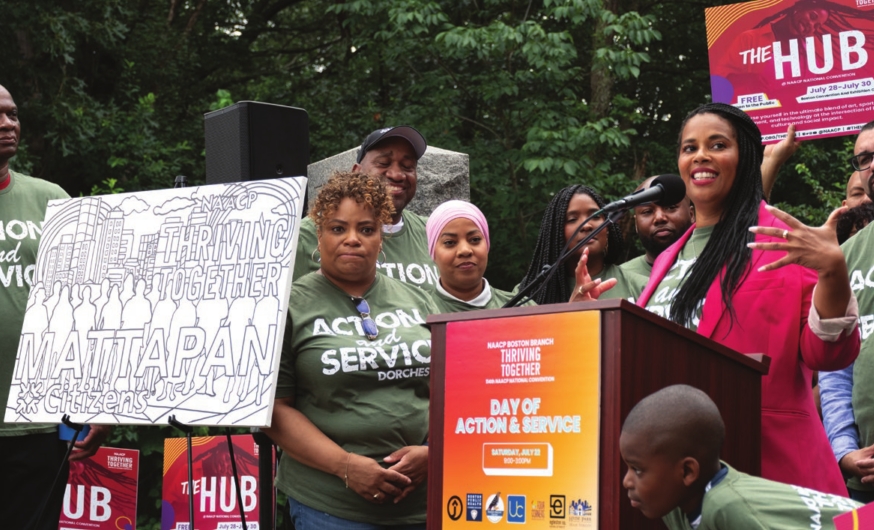 Tanisha Sullivan, president of the Boston NAACP, addresses attendees at a press conference launching a day of service July 22 ahead of the national NAACP convention.