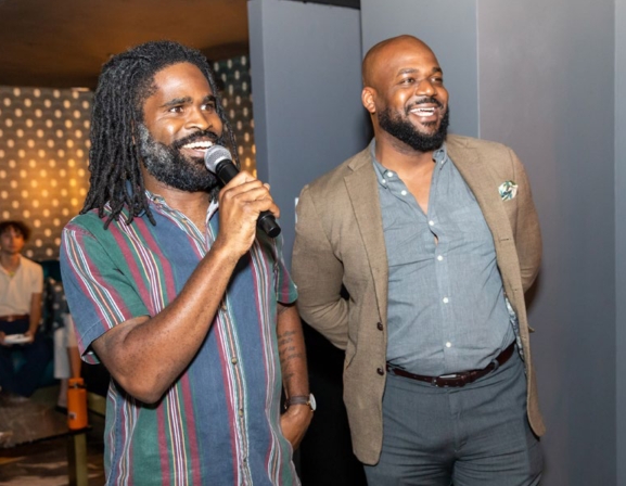 DJ ReaL P and John Borders IV address the crowd at the listening party.