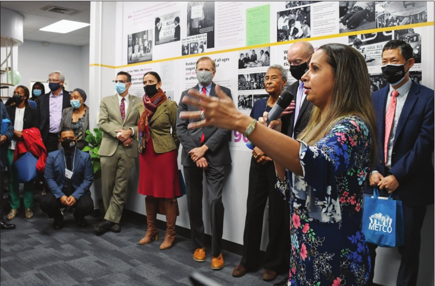 Metco President and CEO Milly Arbaje Thomas speaks at the opening of the organization’s new offices in Nubian Square. Restorative justice, sensitive teaching are the goals