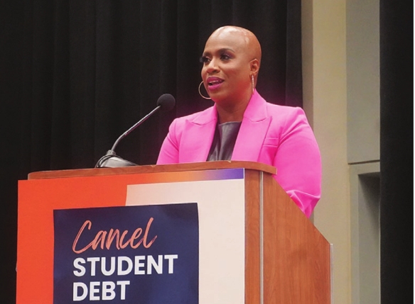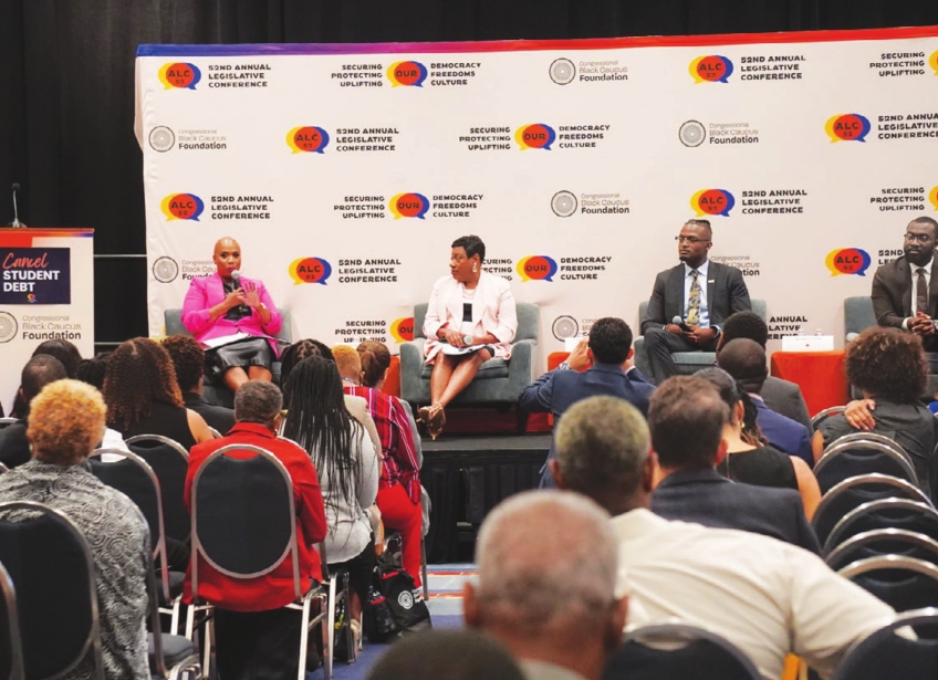 (right) Congresswoman Ayanna Pressley provides opening remarks for her policy discussion titled “Student Debt Cancellation is Essential” at the Congressional Black Caucus’ Annual Legislative Conference.