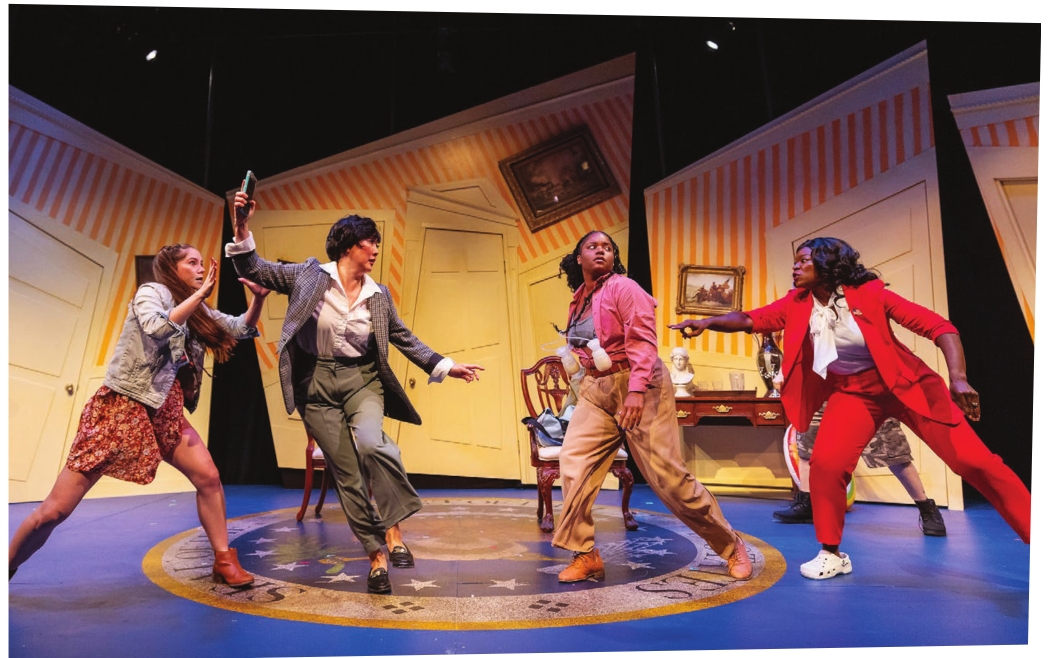 Each actor conveys her character’s individuality while jousting in a high-energy ensemble, coached by fight/intimacy coordinator Angie Jepson. Costumes by Rebecca Glick further the satire. Harriet wears a strict black suit and her evening wear is a black tux ornamented with glistening epaulets. Stephanie is attired in a prim blue cardigan and sneakers; and the first lady, who describes herself as trying to be more “earthy,” always wears red.