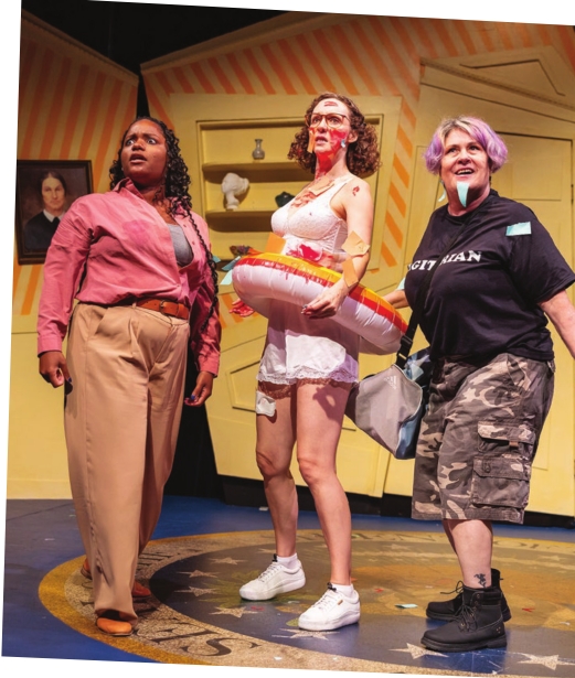 As panic rises, bodies, taunts and props fly, including a bust of suffragist Alice Paul, who in 1920 helped win women’s right to vote. The hurled bust knocks out the title character, unseen except for his feet, which stick out from behind a door.