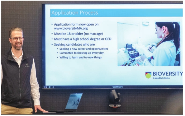 Bioversity Executive Director Zach Stanley addresses attendees at an information session for the new initiative. Eight-week training offers pathway to entry-level jobs in life sciences