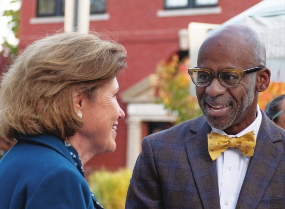 Dimock Center President and CEO Dr. Charles Anderson (right) speaks with Yawkey Foundation CEO Maureen Bleday at the groundbreaking for the center’s new men’s clinical stabilization services program, Oct. 24. The Yawkey Foundation was the lead private donor of the initiative for start the program which, when operational, will be the only one in the city of Boston, and will fill a gap in the center’s continuum of care for addiction services.A new addiction treatment program in Roxbury will attempt to fill a citywide gap in substance abuse disorder care.