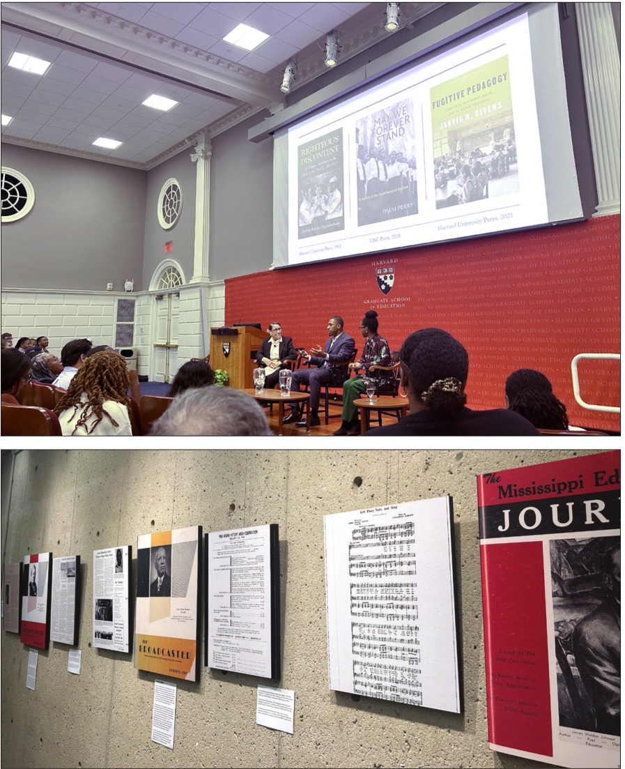 (top) Jarvis Givens and Imani Perry speak at a forum for the opening of the Black Teacher Archive. (above) Physical copies of material featured in the digital archive.