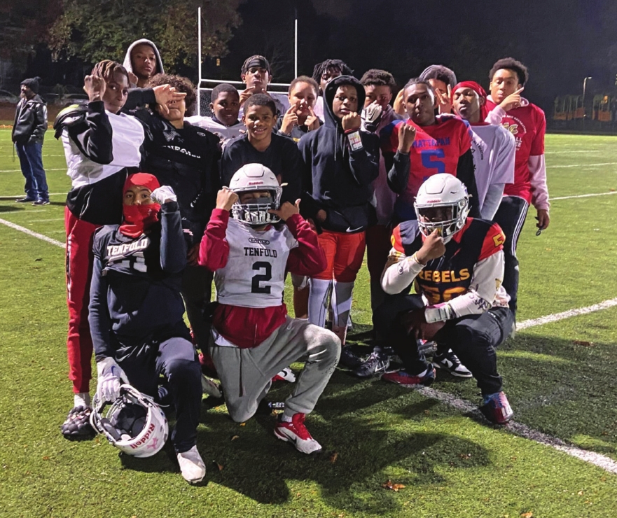 Players of the 14U Mattapan Patriots team line up for a photo after their Thursday night practice. Youth football program boasts high rankings, remarkable season