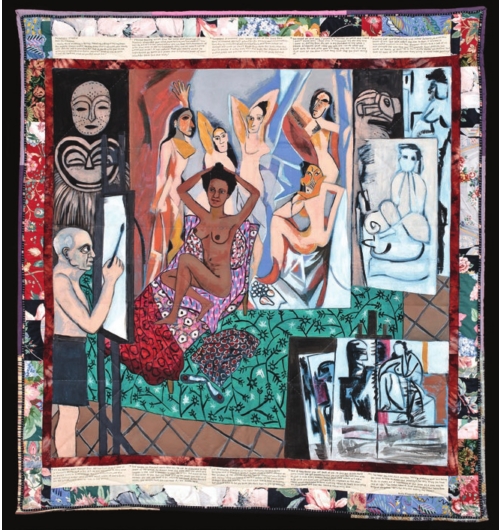 (top) Artist Faith Ringgold; (above) “Picasso’s Studio,” 1991, acrylic on canvas, printed and tie-dyed fabric; (left) “Family of Women Series: Bessie,” 1974, mixed media. © Faith Ringgold / Artists Rights Society (ARS).