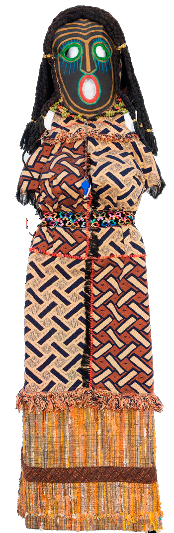 Nearby, two exuberant ritual figures comprising masks and garments evoke African artistic traditions Ringgold discovered in her travels.