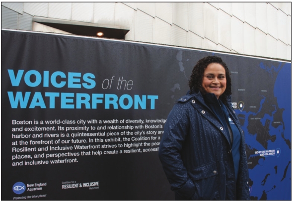 Luz Arregoces, director of community engagement at the New England Aquarium, stands in front of the new “Voices of the Waterfront” exhibition.