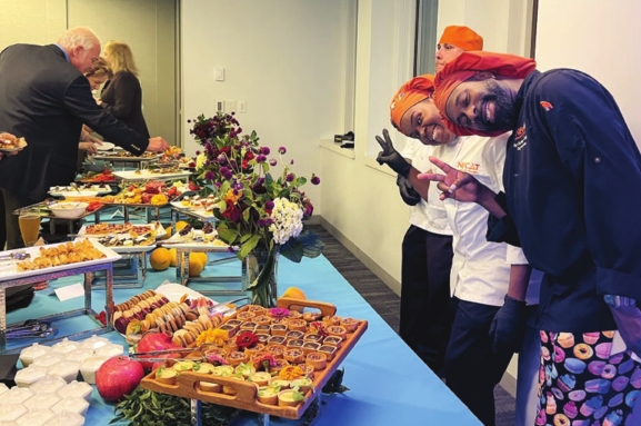 (Above) Chef Chris Faison (center) and a student chef; (Left) Chris Faison and culinary students survey the spread.