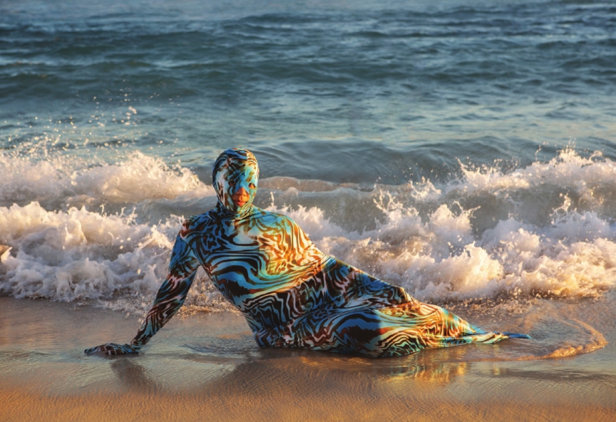 Each of the eight artists in the exhibition explores the connection between colonial oppression and land or water masses. In a particularly poignant series, Dominican American artist Joiri Minaya makes constricted bodysuits featuring images that came up in the Google search “Dominican women.” In her multimedia installations, women wearing the bodysuits are posed in parks and other natural spaces. During “breaks” in the performance, they shed the bodysuits and are able to walk in their own skins without the restrictions of the colonial and male gaze.