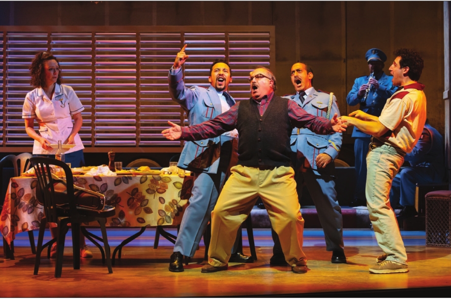 The Alexandria Ceremonial Police Orchestra of Egypt arrives in Bet Hatikvah, a fictional hamlet in the Negev Desert in Israel. They soon learn that they took the wrong bus and must await another the next day to reach Petah Tikva, where they are to perform at the Israeli city’s new Arab Cultural Center. Dina, the town’s hard-bitten café owner, leads her neighbors in offering hospitality to the stranded musicians. With humor and a light touch, the musical renders the band’s night in Bet Hatikvah through three poignant encounters that leave all a bit better off.