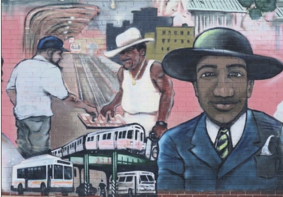 The mural features faces of homegrown activists mixed in with everyday people playing chess, getting their hair done, or just passing through what was then called Dudley Station.