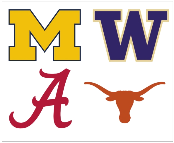 from top left) Team logos for Michigan, Washington, Texas and Alabama,