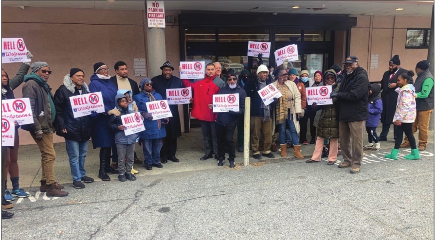 Community members gather Jan. 12 to protest the pending closure of the Walgreens Pharmacy on Warren Street. The closure of the store is the fourth in predominantly Black and Latino communities in Boston in about a year.