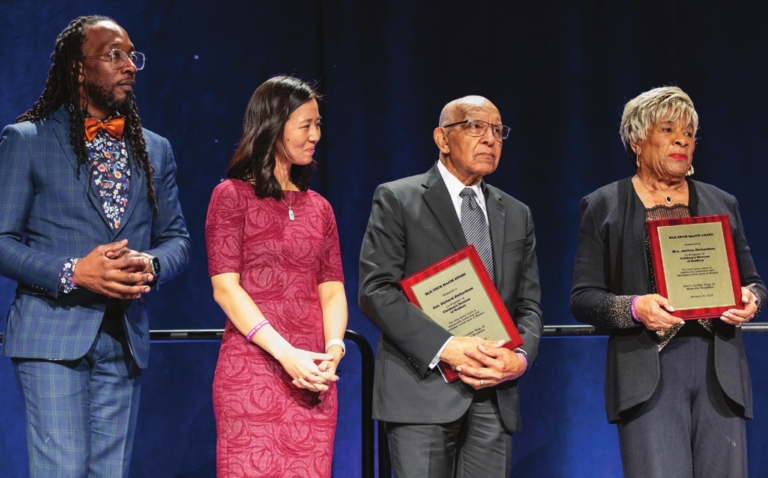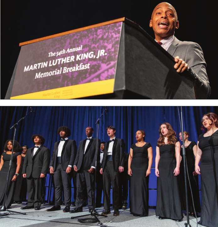 (above) The Rev. Dr. Jay Williams of Union United Methodist Church, Mayor Michelle Wu, and Rev. Richard Richardson and Jestina Richardson, co-founders of Children’s Services of Roxbury, recipients of the MLK Drum Major Award. (above right) Keynote speaker Khalil Gibran Muhammad. (below right) The Boston Arts Academy Spirituals performed “Lift Every Voice and Sing.” PHOTOS: MIKE MEJIA
