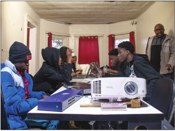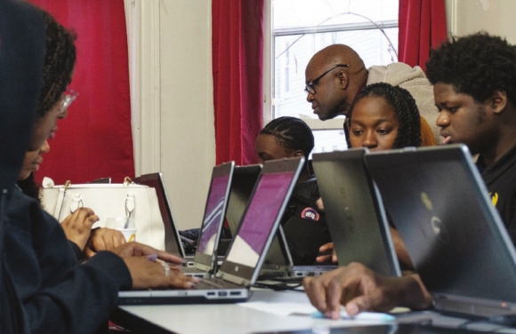 The class operates out of half a Mattapan duplex, in a long narrow space that could have been a dining room in a past life. Now the table stretching the length is lined with chunky laptops, where local students consume computer science and information technology skills.