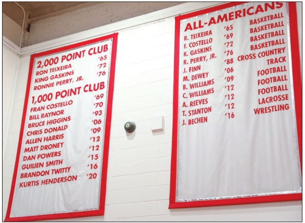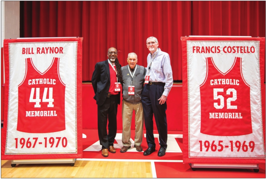 All three now have their playing numbers hanging from the rafters in the Catholic Memorial gym — Gaskins, #14; Raynor, #44; and Costello, #52.