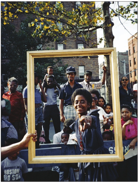 Photographs show O’Grady’s best-known persona, Mlle Bourgeoise Noire (Miss Black Middle Class) making her 1980 debut by invading several gallery openings attired in a tiara and a white gown made out of 180 pairs of white gloves, shouting poems of protest; and in 1983 as she curates “The Black and White Show,” which presented works in black and white by an equal number of artists representing both races. An exuberant wall installation, “Art Is…” (2009), renders scenes from Mlle Noire’s exuberant finale, commanding a float in the 1993 Afro-American Day Parade in Harlem, while assistants photographed parade onlookers posing in gilded frames. Their joyful participation in art-making was O’Grady’s rebuke to a non-artist colleague’s remark that avantgarde art “doesn’t have anything to do with Black people.”