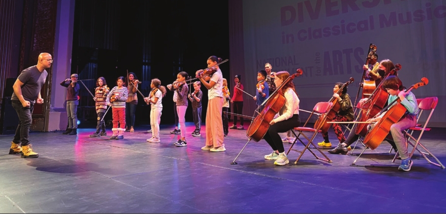 Acclaimed classical violinist and composer Daniel Bernard Roumain stood in front of a group of elementary and middle schoolers at the Strand Theater, framed by a gilded arch and burgundy curtains.