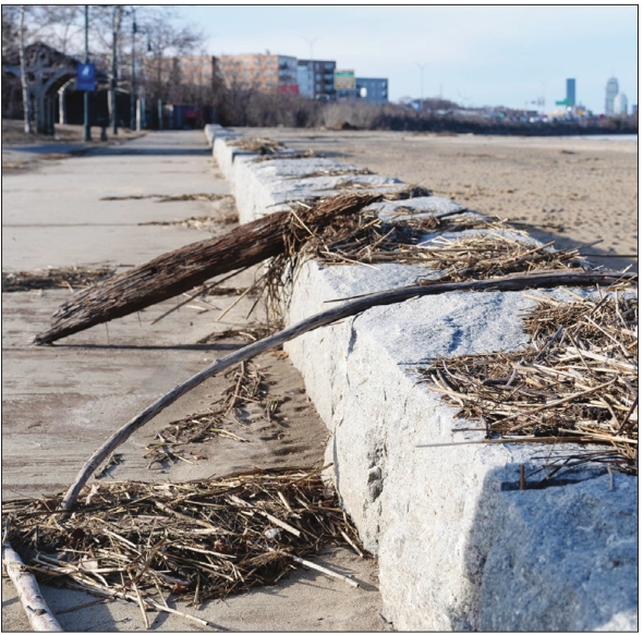Debris carried on shore by a recent king tide litters a pathway at Tenean Beach, Feb. 15.