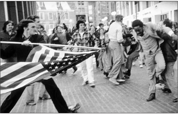 A white teenager, Joseph Rakes, assaults lawyer and civil rights activist Ted Landsmark with a flagpole bearing the American flag in this Pulitzer Prize-winning photo taken by Stanley Forman during the Boston busing crisis in 1976.
