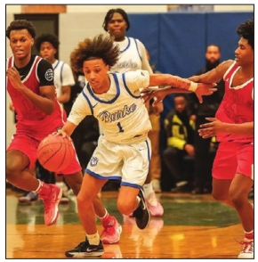 Jeremiah Burke’s Matthew Drayton drives up the court.