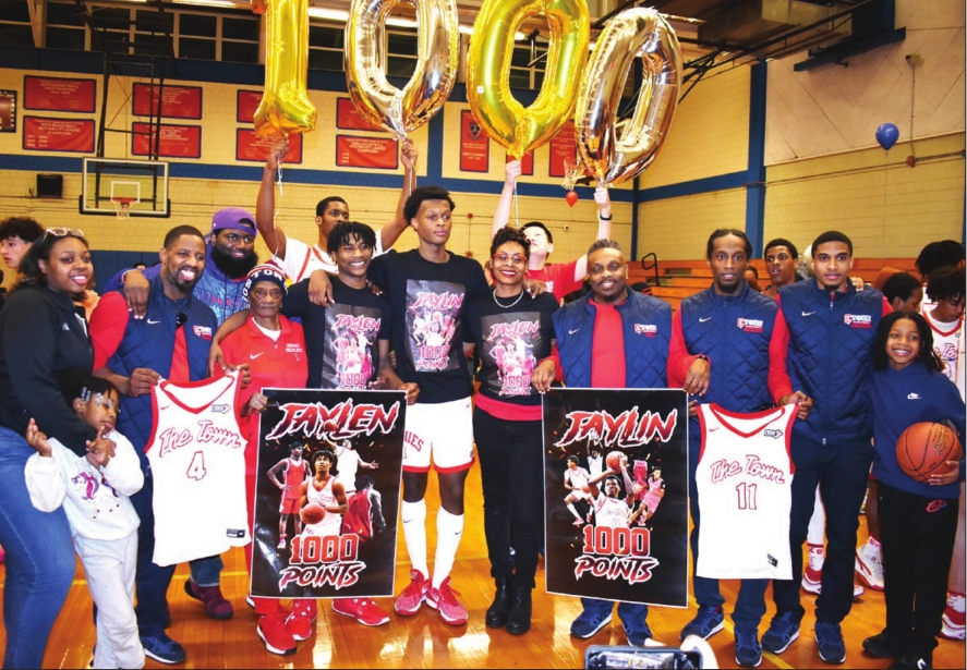(top left) Charlestown High School basketball players celebrate their 1,000-point scorers.