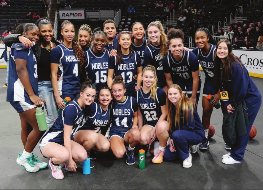 (bottom left) The Noble and Greenough girls basketball team celebrates backto-back NEPSAC championships.