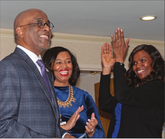 (from left) Attorney Joseph Feaster celebrates at the Edgar Benjamin Healthcare Center with Marise Colsoul, director of nursing, and Leslie Joseph-Henderson, director of admissions, following his appointment as receiver of the facility.