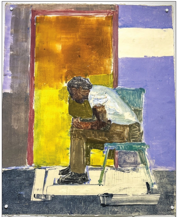 (left) Painter Josué Bessiake; (above) Josué Bessiake’s “Longing at Masako’s Door,” 2023, monotype on paper. Painter Josué Bessiake is obsessed with the dynamics of the ordinary. In his current show at Gallery NAGA, “Josué Bessiake: A Bird’s Last Look,” the ordinary takes the form of chairs. Chairs front and center in abstract styles, chairs in the background at a dinner party, some occupied, others abandoned. In the intimate exhibition, Bessiake explores the relationship between body and object through the lens of these everyday furniture pieces.