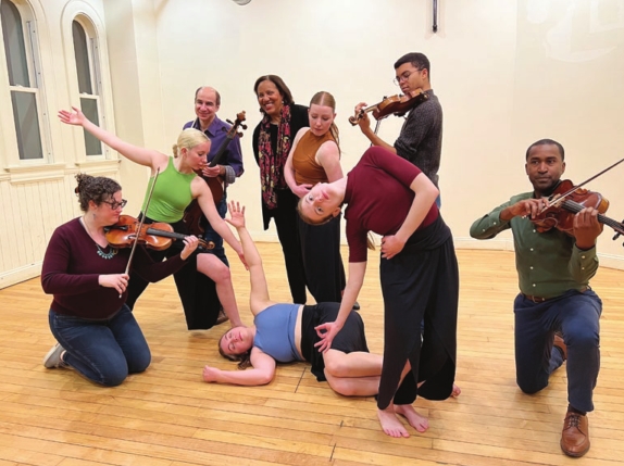 On a recent evening, the jolting sounds of string instruments filled a room that was half dance studio, half gym. A quartet stood in the center of a mat-covered section of the space, each member stationed behind a music stand. Three dancers circled the ensemble, cycling through a series of turns and leaps and kicks, accompanied by the colliding notes of one cello, two violins and one viola — an unusual sight for a classical music performance, yet still engrossing.