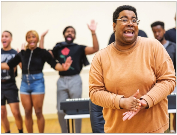 (above) Cast members strike a pose in rehearsal for “A Strange Loop.” (from left) Grant Evan, Kai Clifton, Jonathan Melo and Zion Middleton. (right) Usher, played by Kai Clifton, foreground, is backed up by his Thoughts.