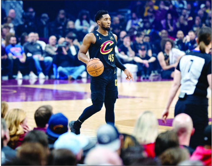 Cavaliers guard Donovan Mitchell walks the ball up the court.