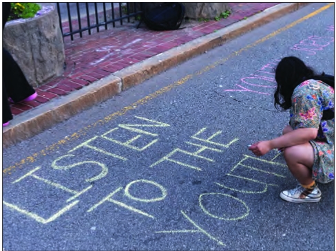 A protester writes in Congress Street during a youth-organized rally, June 7, in support of City Council budget amendments that would redirect some police funding into housing and youth jobs.