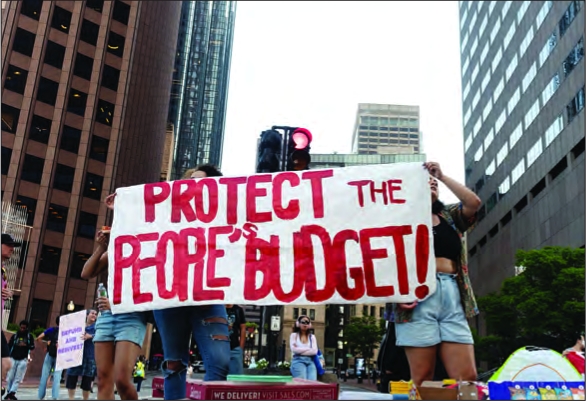 The protesters from the Youth Justice and Power Union, alongside supporters, shut down Congress Street for about two hours, setting up tents in the road, decorating the pavement with chalk and calling into a megaphone for preservation of the $4.5 million that the City Council voted to move from the Boston Police Department budget into employment programs for youth, as well as rental subsidies and community land trusts. The budget overall totals at about $4.6 billion.