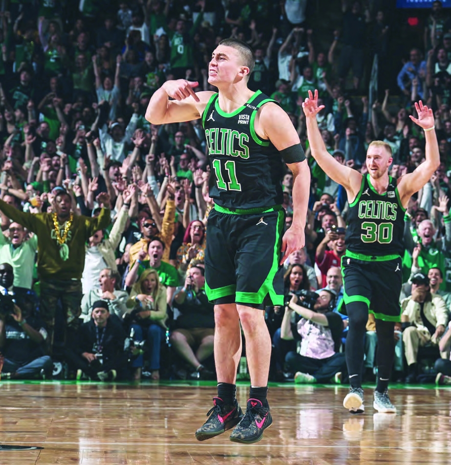 Celtics guard Payton Pritchard celebrates after hitting 38-foot buzzer beater.