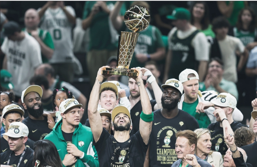 Boston Celtics Star Jason Taytum holds up the Larry O’brien Trophy after the Green Defeat the Dallas Mavericks 106-88.
