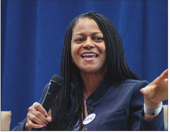 Dr. Bisola Ojikutu, executive director of the BPHC, moderates a panel at the Health Equity Trends Summit, June 6.