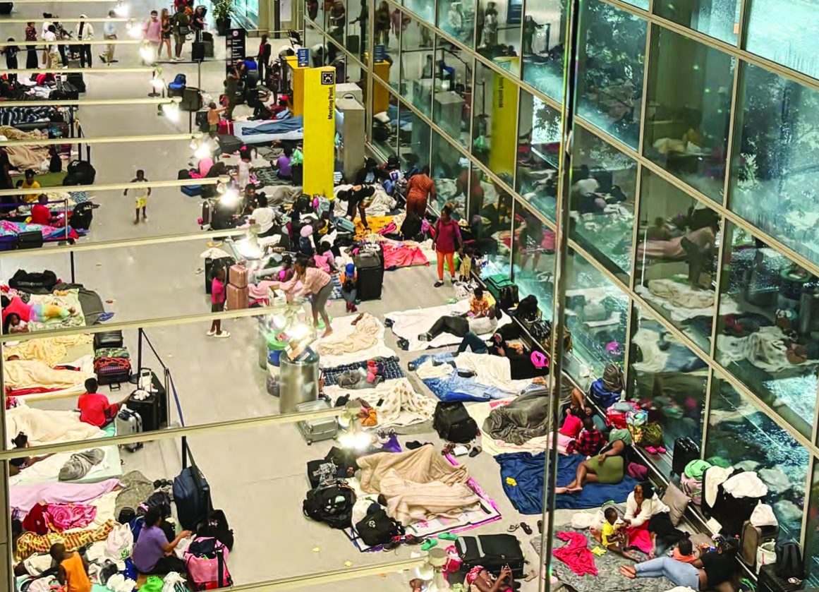 On a recent Thursday night, blankets and pillows were sprawled across the floor as the families prepared for bed. Some travelers passing through paused to observe the families as boarding calls blared through the airport speakers.