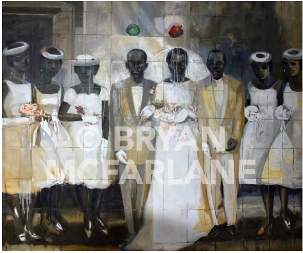 “If you look to the left,” she continued, “you see ‘Haiti Victorious 1 and 2.’ That is a digital collage with lots of different types of filters and nuances. There’s the Haitian flag represented and the hibiscus flower. The two young people who are there represent a new generation of leaders.”